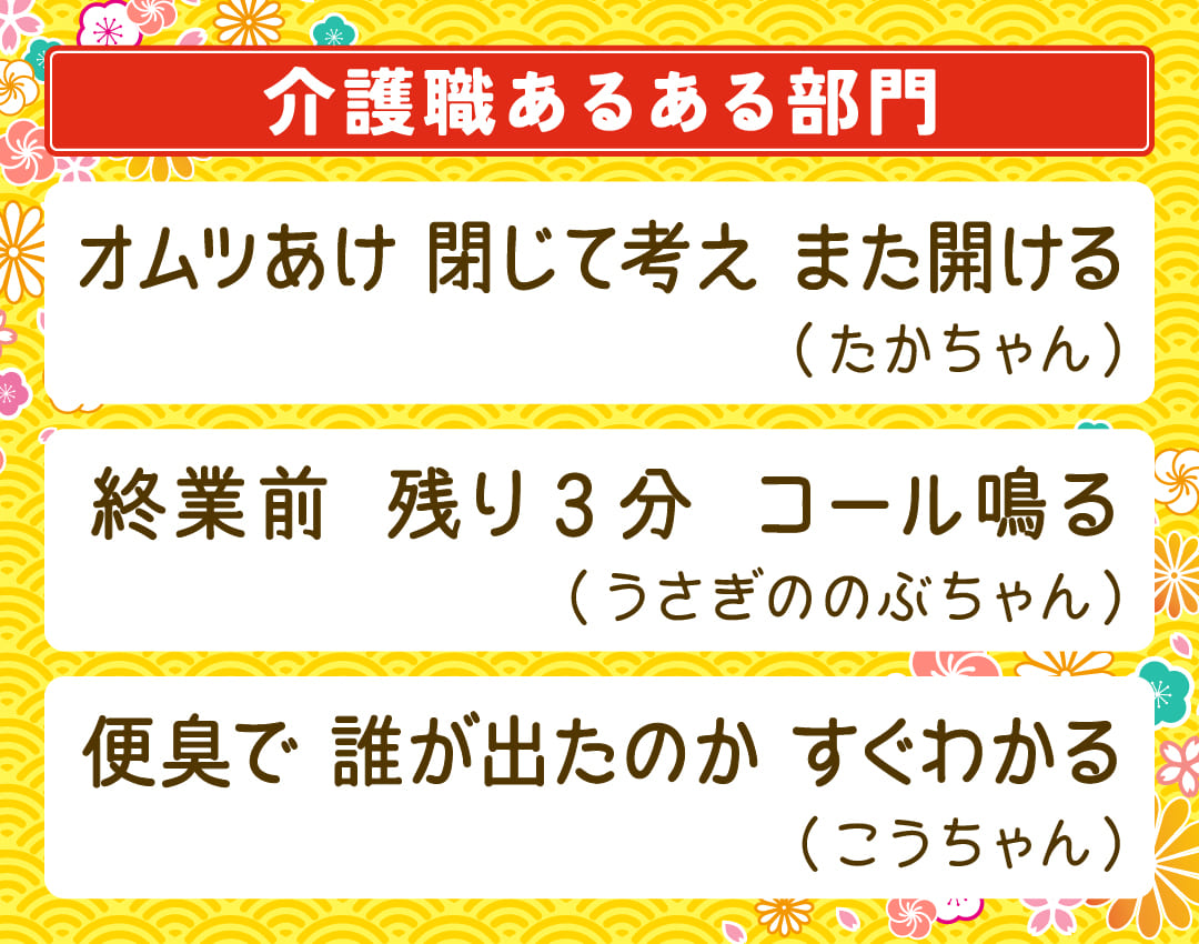 ケアきょうファンのみなさまから合計で154句もの作品が寄せられ、介護の現場の「あるある」、本音、そして心温まる瞬間が五・七・五のリズムに乗せて表現されました。