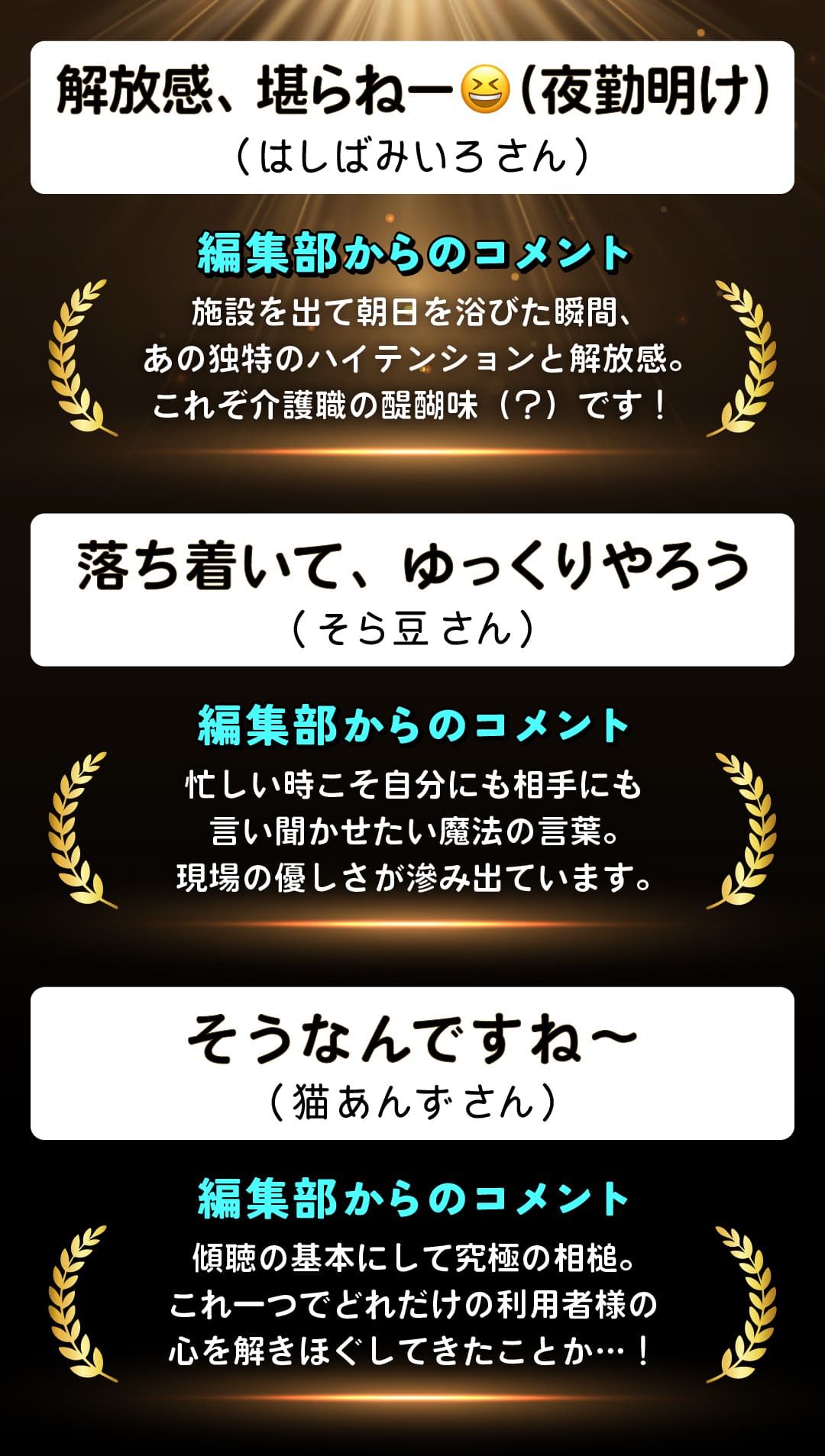毎日介護職として働く中で生まれる言葉には、「介護の真実」が詰まっている感じもしますね。