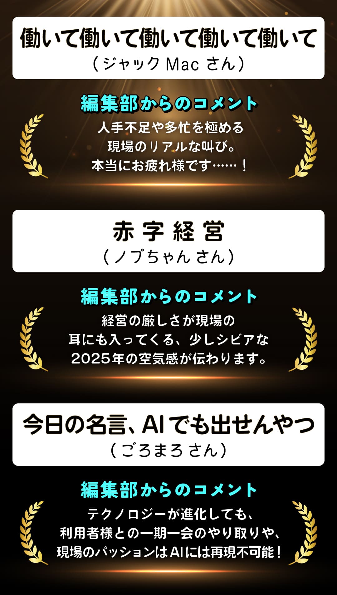 今年ならではの空気や背景がにじむ、介護職の2025年を象徴する言葉が集まりました。物価高などを背景に厳しい状況もありつつ、介護職らしい現場のプライドも感じられます。